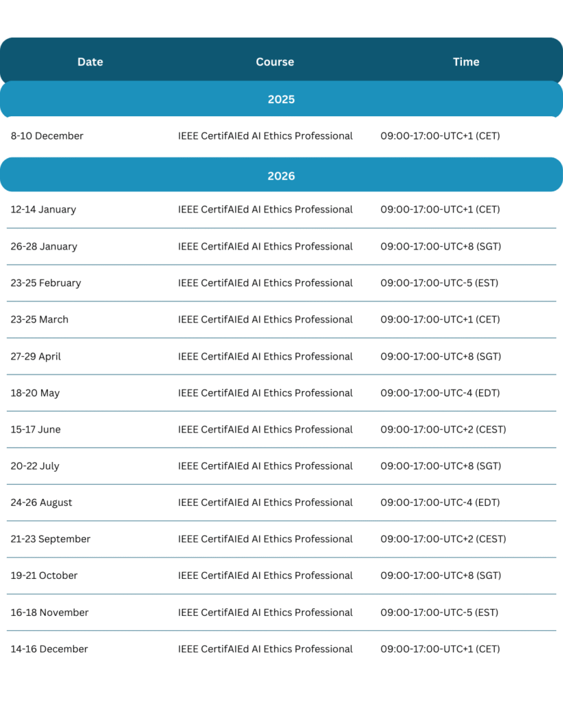 Join us for an enriching virtual training experience, focusing on AI ethics and assessment in line with IEEE standards. This event is a stepping stone for those aiming to become IEEE CertiAIEd™ Lead Assessors
